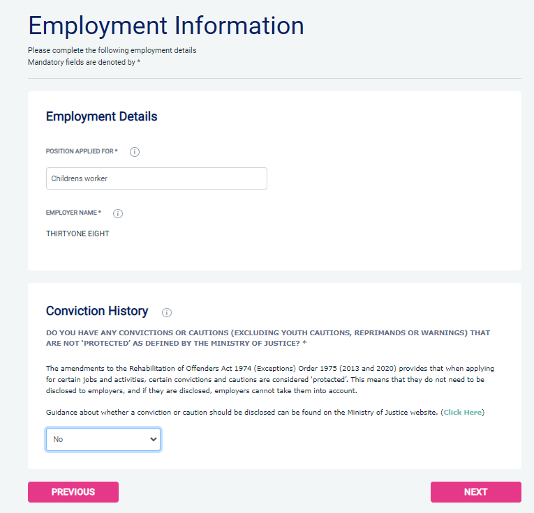 In this section you need to give details about the role you are applying for and any previous conviction information.