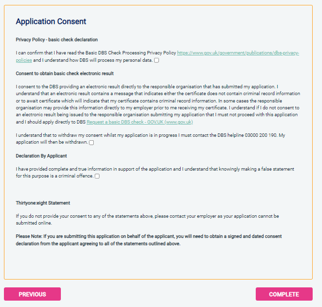 The first two check boxes relate to giving your consent to transfer your information to Thirtyone:eight, our agent and the Disclosure and Barring Service. Check both these boxes.