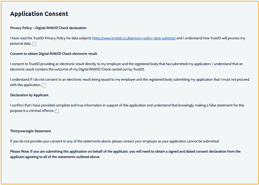 The first two check boxes relate to giving your consent to transfer your information to Thirtyone:eight, our agent and SP Index (the provider on the Media check) . Check both these boxes.